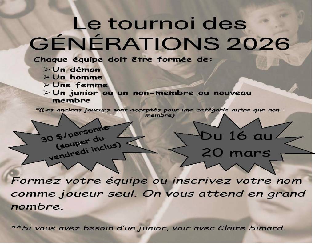 Voici l’information concernant le tournoi des générations qui aura lieu du 16 au 20 mars.